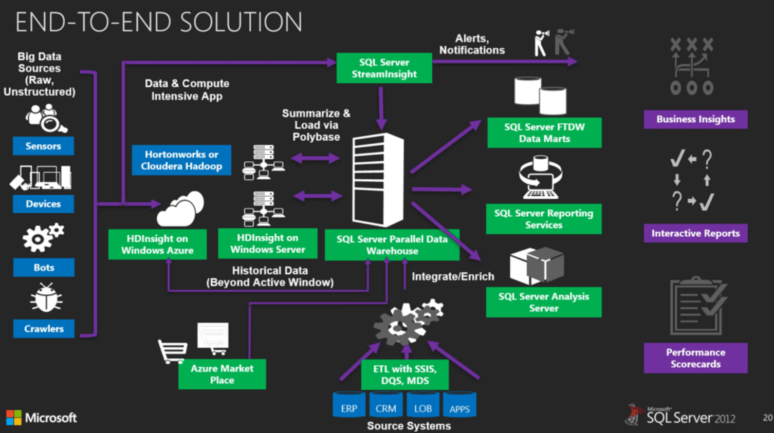 - Polybase – Na minha opinião uma baita novidade, sinceramente algo que vai muito além de uma novo recurso, mas sim um novo horizonte para os profissionais, desenvolvedores e administradores de banco de dados, funcionalidade que vai permitir um avanço enorme no que se diz respeito a Interoperabilidade do SQL Server com outras tecnologias Non-SQL, como também, tecnologias de acesso e armazenamento de dados dentre elas o Hadoop. O PolyBase é uma nova tecnologia que integra o produto o MicrosoftSQL Server Parallel Data Warehouse (PDW), com Hadoop. Ele é projetado parapermitir consultas através de dados relacionais armazenados no PDW e dadosnão-relacionais armazenados no Hadoop de forma distribuída através do sistema arquivos Hadoop (HDFS), ignorando MapReducedistribuído, reconhecido como motor do Hadoop que normalmente é usadopara ler dados do HDFS. Você pode criar uma tabela externa em PDW quereferencia o Hadoop dados (como um servidor vinculado) e você pode consultarisso com SQL, em essência, adicionando estrutura para dados não-estruturados.